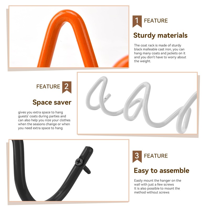 Elevate your home storage with the Bumtosc Heavy-Duty Steel Wave Coat Hooks—a perfect blend of industrial strength and minimalist elegance. Crafted from high-strength steel and finished with a durable powder-coated surface, these hooks are engineered to hold up to 20KG, ensuring years of reliable use for heavy coats, bags, umbrellas, and more. Easy Installation, Perfect Alignment Simplify setup with our color-coded system: Each hook comes with matching screws and a foolproof guide. Whether you’re mounting them vertically or horizontally, the sleek wave design adds a modern touch to walls, while rounded edges protect fabrics from snagging. Multi-Scenario Use, Premium Aesthetic From entryways to bathrooms, these hooks organize your space effortlessly. Hang jackets, hats, scarves, or even decorative plants with confidence. The scratch-resistant finish and hand-polished details ensure a luxurious look that complements both rustic and contemporary styles. Why Choose Bumtosc? - Unmatched Durability: High-strength steel core resists deformation under heavy loads. - Eco-Friendly & Safe: Non-toxic powder-coated finish ensures family-friendly use. - Space-Saving Design: 12.6-inch width accommodates multiple items without clutter. - 3 Stylish Colors: Matte Black, Creamy white,and eye-catching orange to match your theme. Key Features: ✔️ Heavy-duty 20KG capacity ✔️ Premium steel + powder-coated finish ✔️ Color-matched screws for seamless installation ✔️ Versatile as coat hooks, wall hooks, or umbrella hooks ✔️ Scratch-resistant and weatherproof