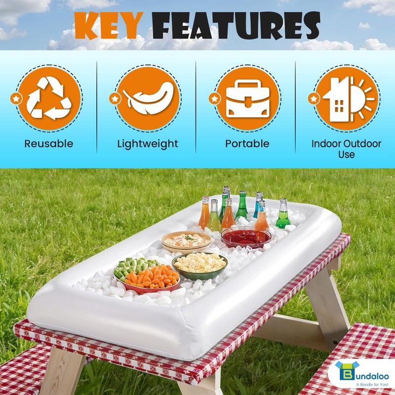 Chill your food and drinks with ease at every event! The Bundaloo Inflatable Salad Bar Buffet is the ultimate portable cooling tray for parties, BBQs, and gatherings of all kinds. Whether you're hosting indoors or out, this extra-large 51-inch serving bar is the convenient, reusable solution for keeping items fresh, cold, and ready to serve.