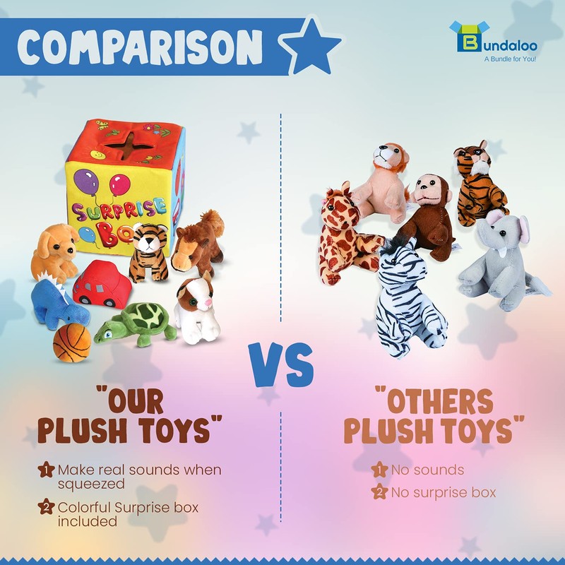 Bundaloo Surprise Box with 8 Plush Toys - Soft Sensory Playset of Stuffed Animals with Sounds for Babies & Toddlers