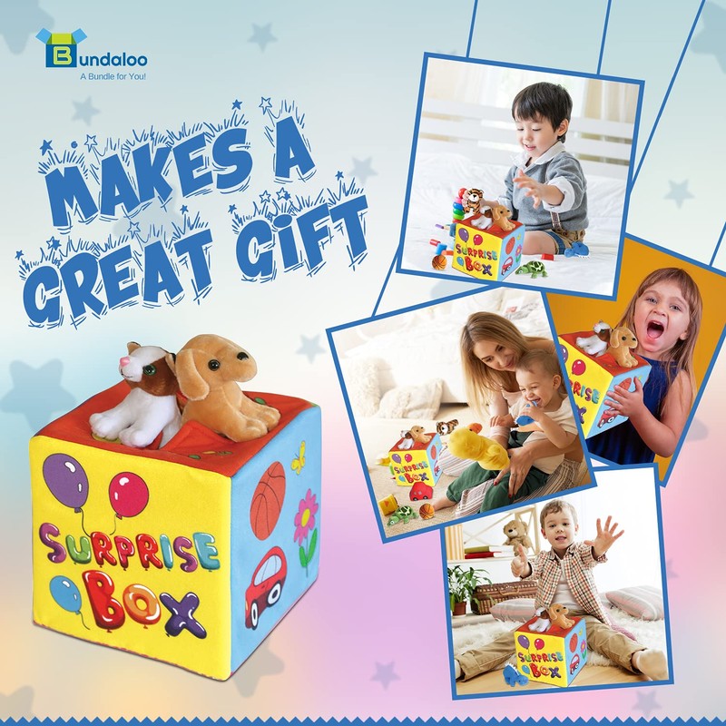 Familiarize children with different sounds and animals with the Bundaloo Surprise Box with Plush Toys!