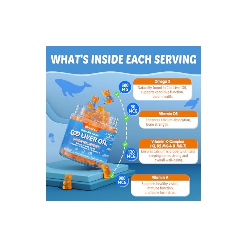 - Cod Liver Oil Gummies, ALL-IN-ONE WELLNESS: Elevate your family's health with our Cod Liver Oil Gummies! Infused with essential vitamins A, D3, K2, and Omega-3, these gummies support bone health, boost the immune system, and improve overall vitality. The refreshing orange flavor transforms nutrient intake into a joyful experience that adults and kids will love. Science-backed recommended Omega 3 support every child's brain health, making wellness a treat with every gummy!
