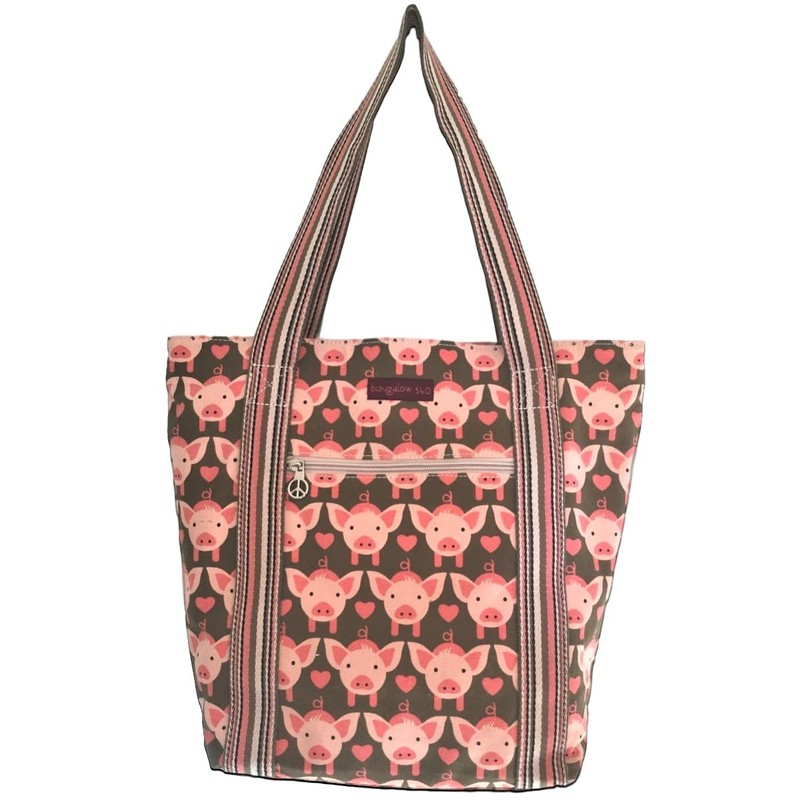 - Outside: Top zippered closure. Front zippered pocket (6.5" x 9") with signature peace sign zipper-pull