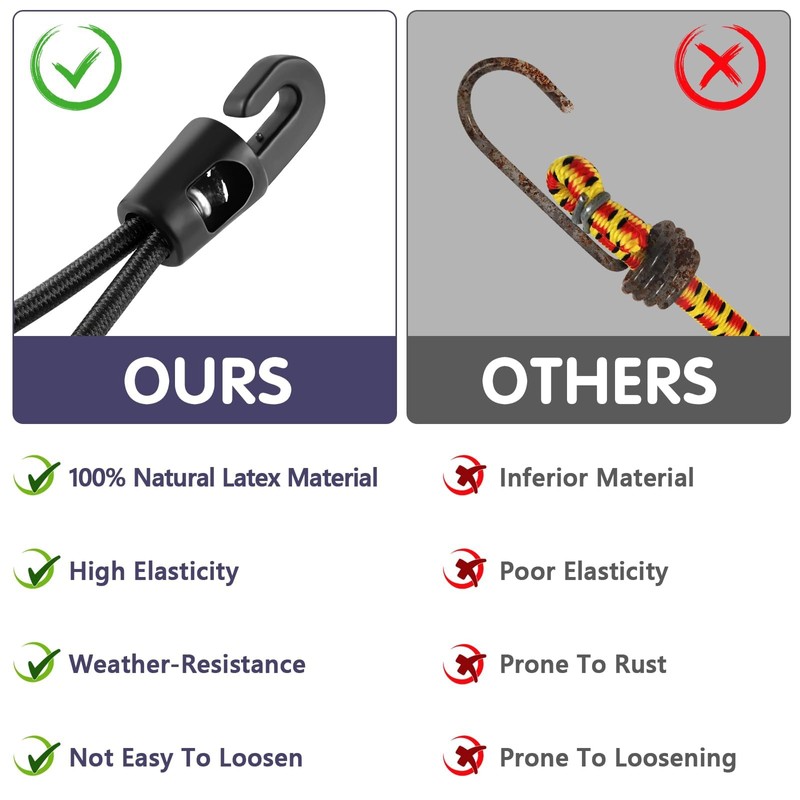 In addition, in order to meet your need for length, we also provide multiple sizes of bungees with hooks for you to choose from-4 inches/6 inches/10 inches.
