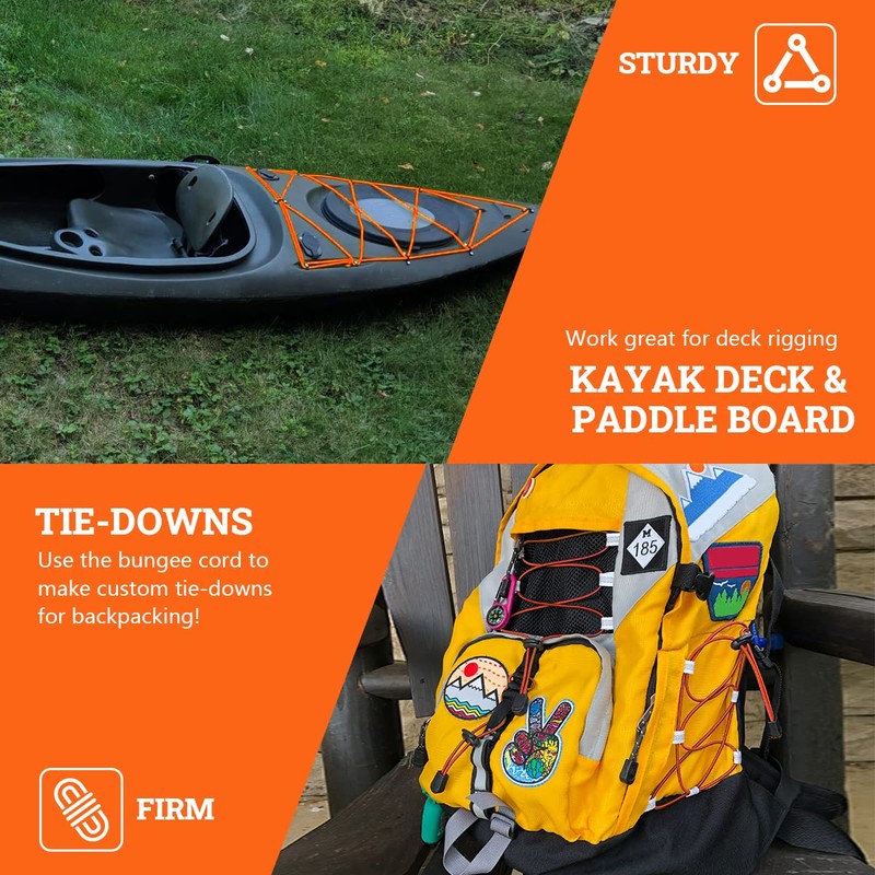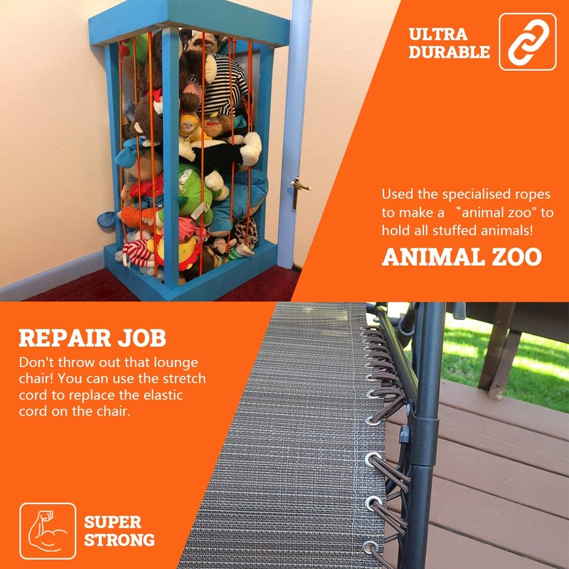 - This elastic nylon cords and hooks kit will work perfect for any need, whether you're using it for arts and crafts, tie down straps, kayak / canoe rigging, zero gravity chairs, outdoor exercise, fitness, camping, rod leashes, cargo net, securing a roof rack, trampoline, zipline, or your own home project this rope will do the job.