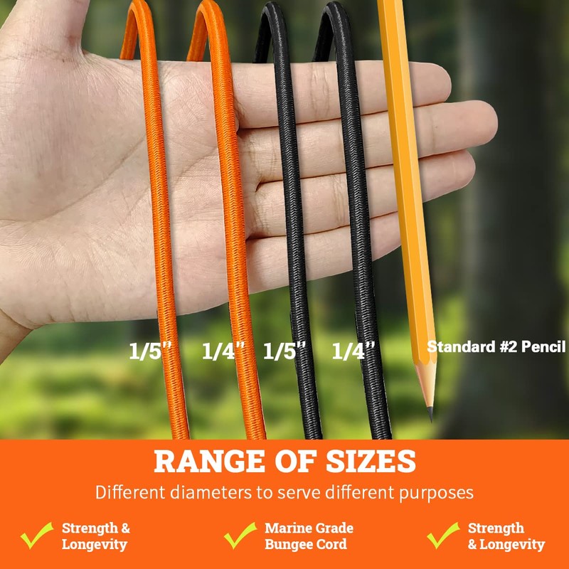 - Industrial Strength Shock Cord - Top-quality marine grade bungee cord with industrial level strength, stretch, and longevity! High Quality distinctive design that is built to last. The elastic cord is perfect for creating bungie straps, hammocks, cargo nets, kayak deck string and other crafting projects.