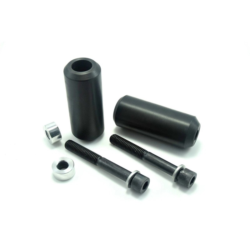 Delrin frame sliders have been used on street bikes for years to protect the sides in case of a crash. Delrin by nature is very resistant to shattering under high impact and has a slippery quality making it slide across the pavement as opposed to digging in and causing the bike to flip.