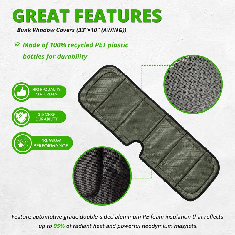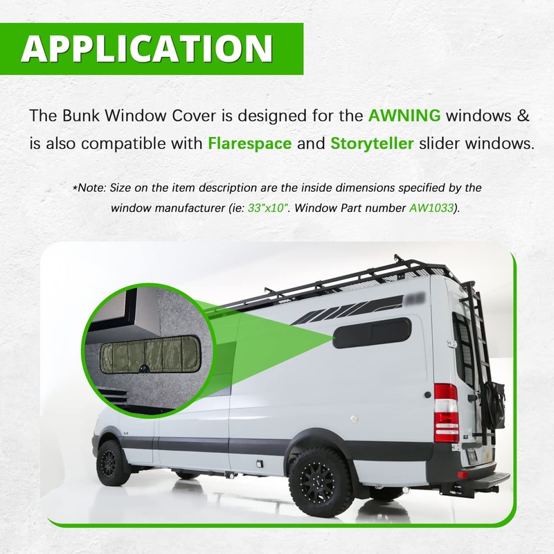 - 【Features】Size on the item description are the inside dimensions specified by the window manufacturer (ie: 33”x10”. Window Part number AW1033).Colored fabric on the inside and black on the outside to support stealth camping and provide interior privacy.