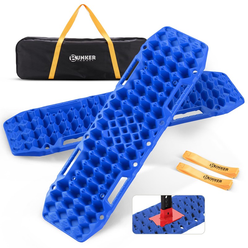 BUNKER INDUST Off-Road Traction Boards with Jack Base,Pair Recovery Tracks Pads 4X4 Vehicle Truck SUV Car Emergency Tire Traction Mat with Bag/Leash -Sand,Mud,Snow Ladder Recovery Ramps(Blue)