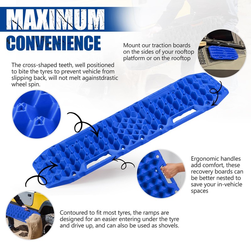 - Double Capabilities: Abandoning traditional design, both sides of the traction recovery board adopt the same diamond array construction to significantly increase friction and can also be used to get your vehicle unstuck.
