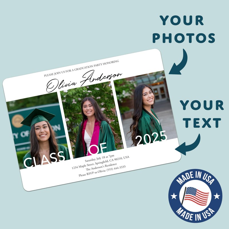 - MADE IN THE USA - All of our photo graduation cards and personalized graduation announcements are proudly made in Michigan.