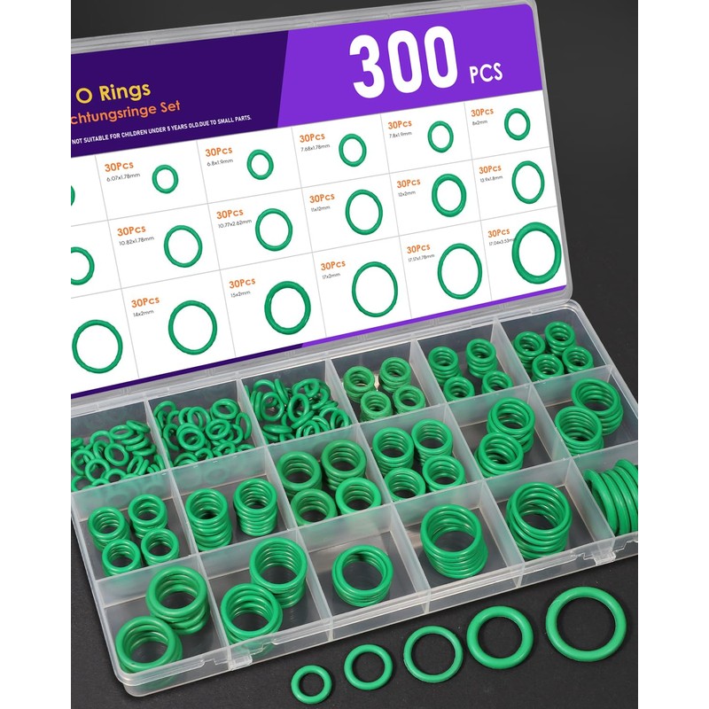BUNTOR 300PCS O Rings Rubber Assorted Seal Kit, 18 Sizes Rubber O Rings, Car Air Conditioning O Ring Kit, Car Auto Vehicle Repair (Green)