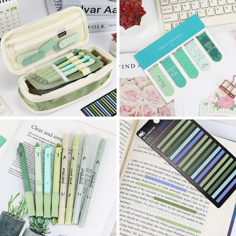 Buqoo 11 PCS Aesthetic Students Supplies Retractable Cute Pen Case Set,with 4PCS 0.5mm Gel Pens & 4 Highlighters & Magnetic Bookmark & Index Tab and Pen Pouch (Green)
