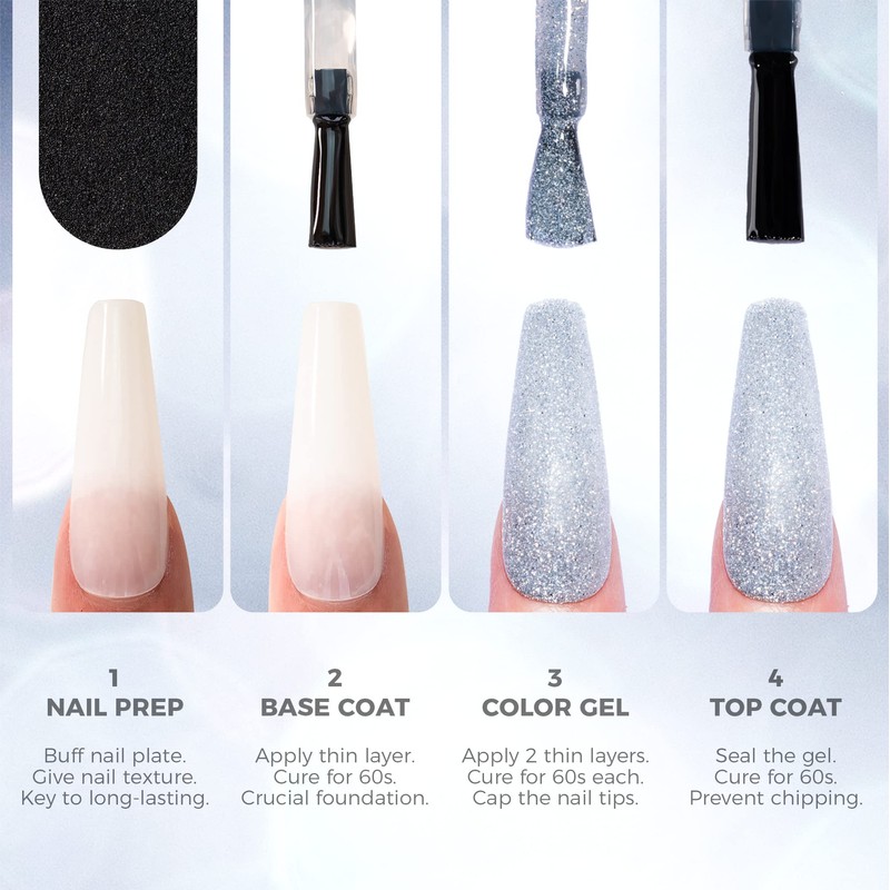 - Super Easy Done – Apply basecoat and cure the led lamp, then apply the reflective gel and cure the lamp, apply the reflective gel again and cure the lamp, apply topcoat, DONE!