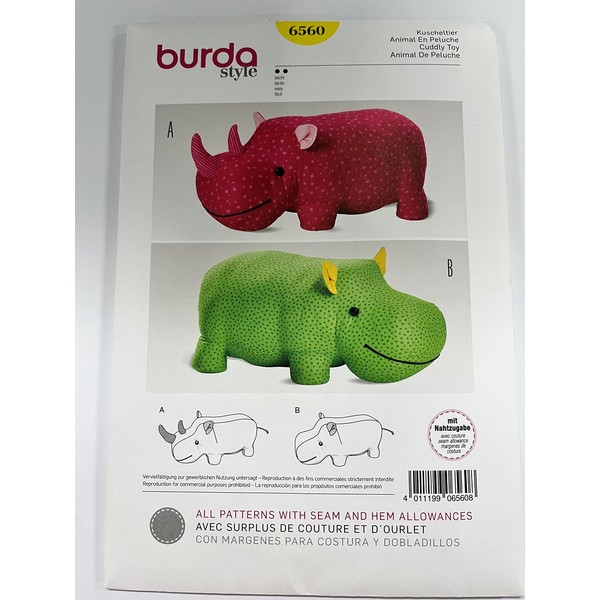 BURDA SEWING PATTERN RHINO OR HIPPO BIG STUFFED ANIMALS FOR LITTLE KIDS 6560