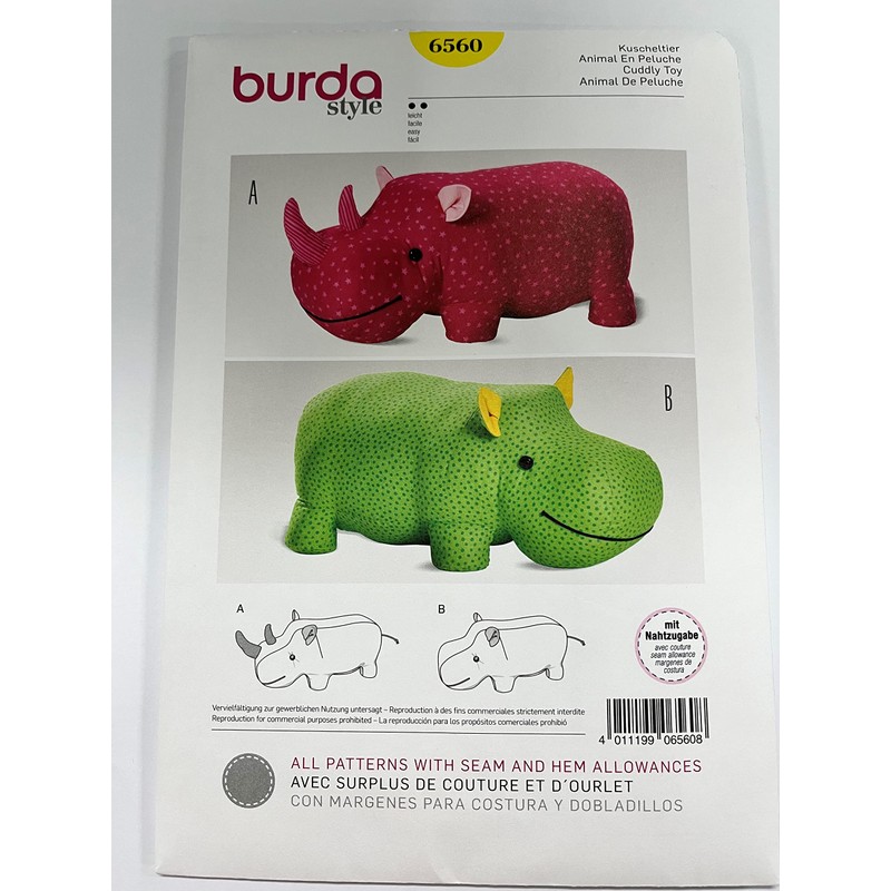 Burda sewing pattern 6560 for sewing a rhino or hippo in size 67 cm length and 33 cm height.