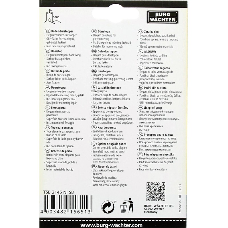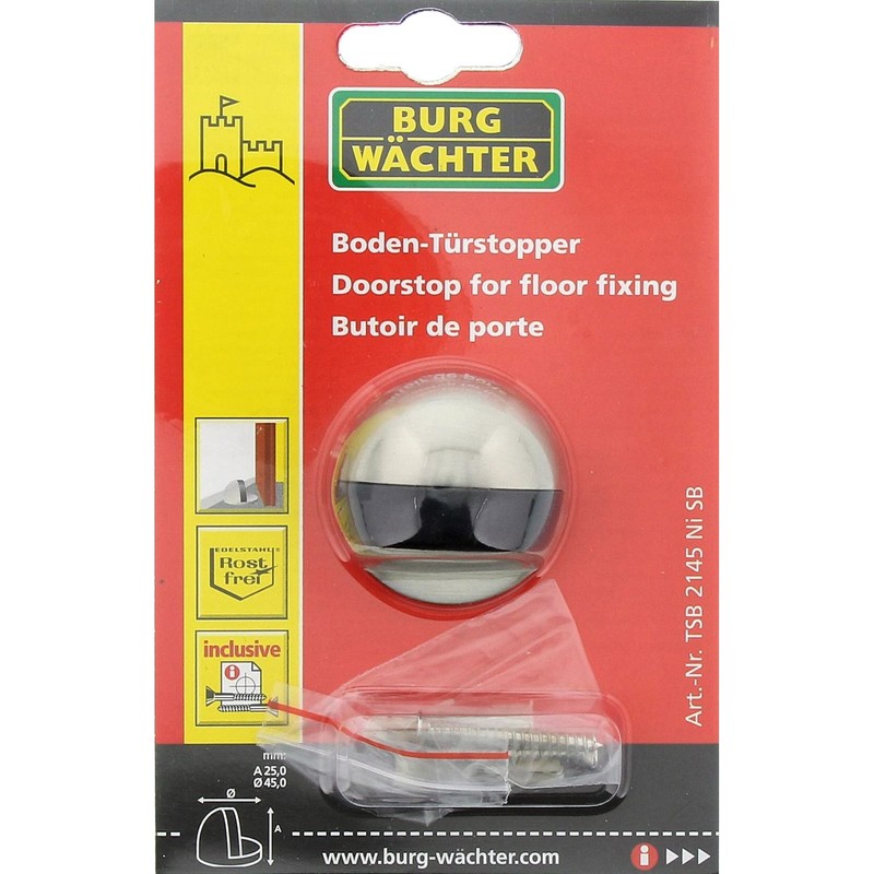 - Lieferumfang: BURG-WÄCHTER Boden-Türstopper, TSB 2145 Ni SB, Inkl. Befestigungsmaterial, Maße (HxØ): 25 x 45 mm, Edelstahl-Optik