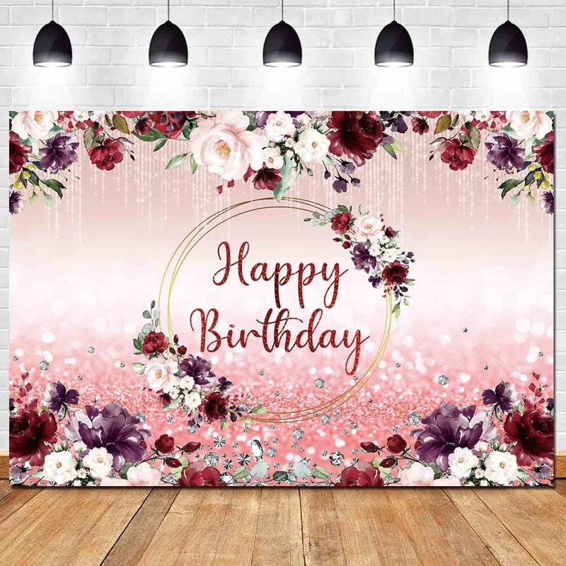Burgundy Flower Happy Birthday Photography Backdrops 72.8x43.3inch Rose Gold Glitter Blush Photo Background for Women Lady Girl 16th 30th Birthday Party Decorations Banner Photo Booth Supplies