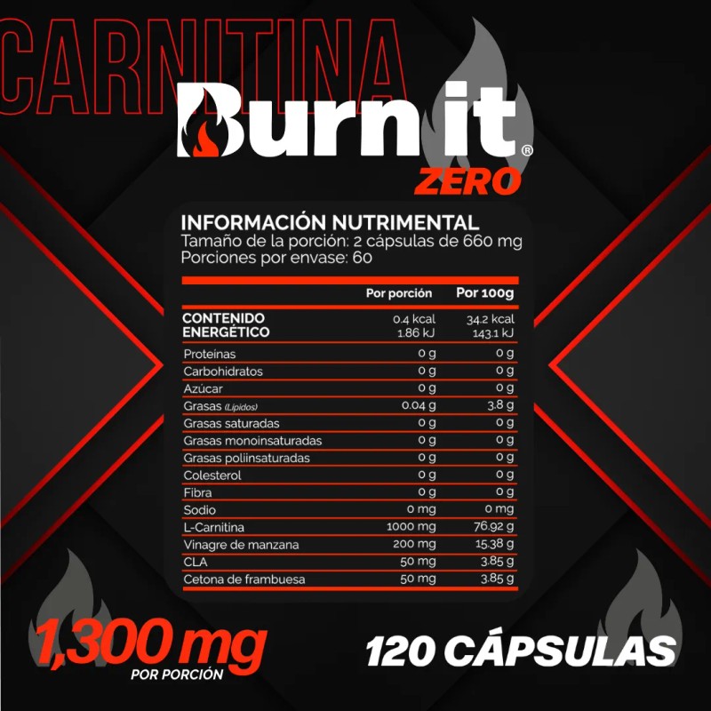 Burn it Zero Quemador Grasa Termogenico 4en1 1300mg: L Carnitina, Vinagre de Manzana, CLA, Cetonas | Suplemento alimenticio 120 capsulas