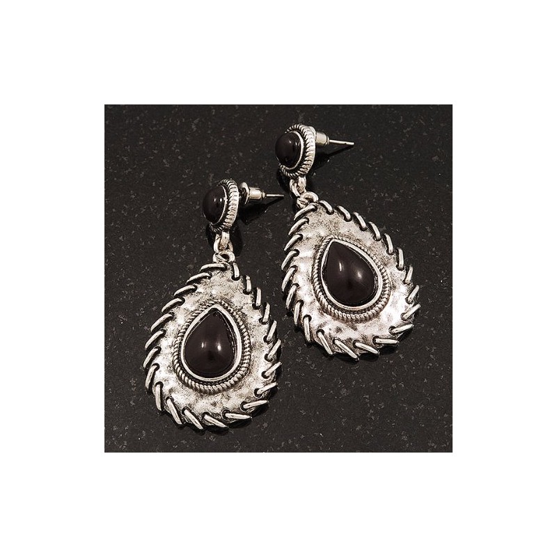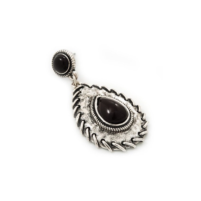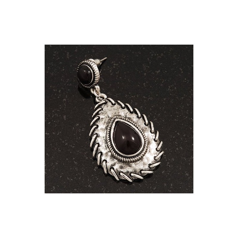 Burn Silver Teardrop Black Resin Stone Drop Earrings - 5cm Length