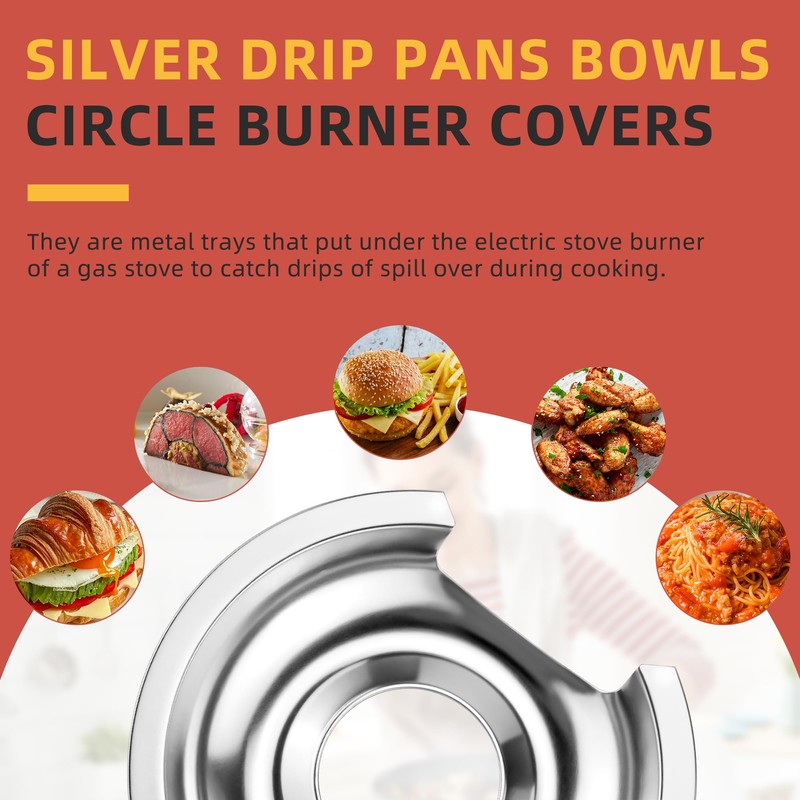 - 【SIZE】The size of the silver drip pans circle burner covers: ① 715877: length 6.37"/ 16.2cm, width 6.37"/ 16.2cm, ② 715878: length 8.38"/ 21.3cm, width 8.38"/ 21.3cm. Silver drip pans burner covers 715877&715878 has good performance,is made of strong metal steel,can be reused