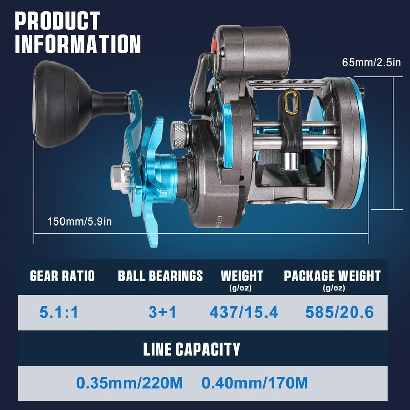 - LINE COUNTER TROLLING REEL – The line counter reels feature a mechanical line counter function that measures in feet. 3 double shielded, stainless-steel ball bearings plus an instant anti-reverse bearing. Precision cut brass gears and stainless steel pinion gear plus machined brass worm shafts and stainless-steel guide shaft make this conventional fishing reel powerful, durable and reliable.