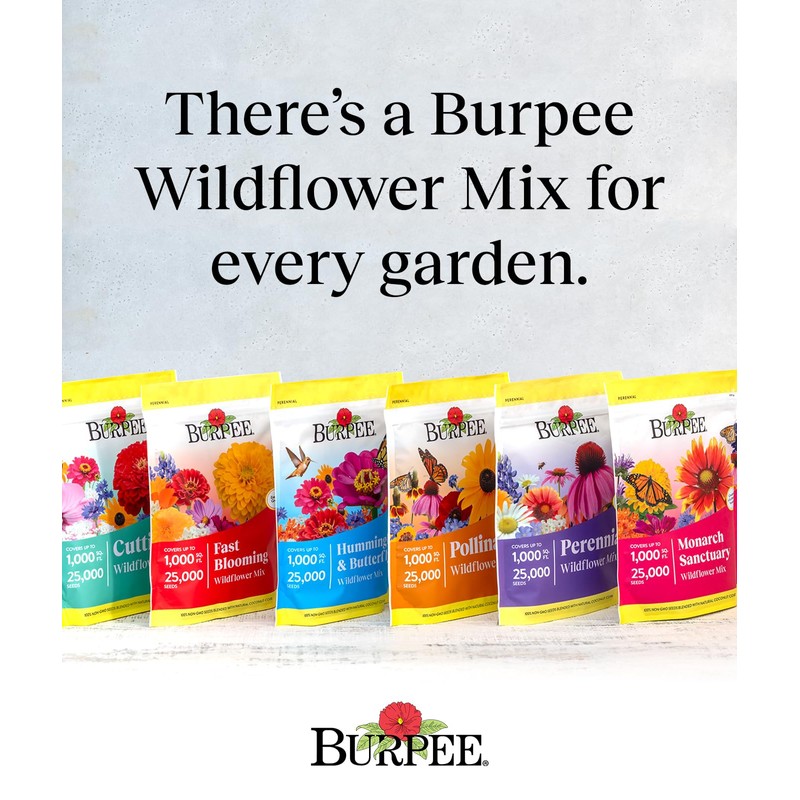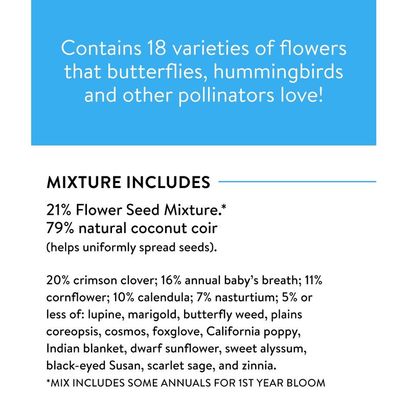 Burpee's Hummingbird and Butterfly Mix of wildflower seeds is beautiful and easy to grow. One bag contains 50,000 non-GMO seeds and covers 1,000 square feet. The mix contains 18 varieties of wild flowers, including annual flower seeds and perennial wildflower seeds. Blooms in spring, summer and fall! The blend of wild flower colors, shapes, growing habits and scents is irresistible to beneficial pollinators, including birds and butterflies. Bag includes: Butterfly Milkweed, Calendula, Cornflower, Plains Coreopsis, Cosmos, Foxglove, California Poppy, Perennial Gaillardia, Annual Baby's Breath, Dwarf Sunflower, Sweet Alyssum, Perennial Lupine, Black Eyed Susan, Scarlet Sage, African Marigold, Crimson Clover, Nasturtium and Zinnia. 100% GUARANTEED: Burpee is committed to the satisfaction and success of all gardeners. We treat each order with special care to ensure healthy seeds are packaged and shipped in excellent condition. If you are unsatisfied with your purchase, we aim to make it right!