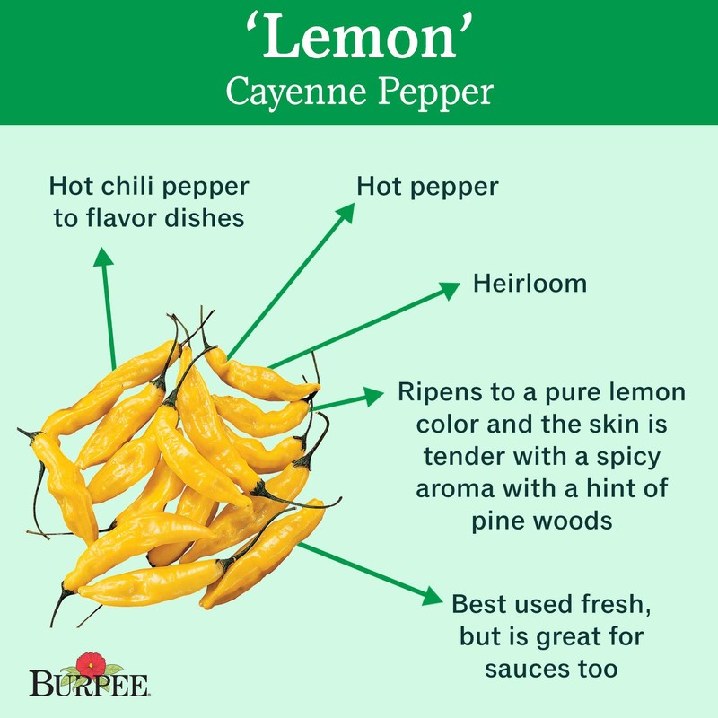 - PICK YOUR FLAVOR: Burpee offers a wide variety of pepper seeds for all your culinary needs. In the mood for a spicy chilli? Spicy cayenne varieties like our “Lemon” Heirloom make great additions to any home-made dishes. Our full varieties include: bell, jalapeno, cayenne, hot & sweet peppers.
