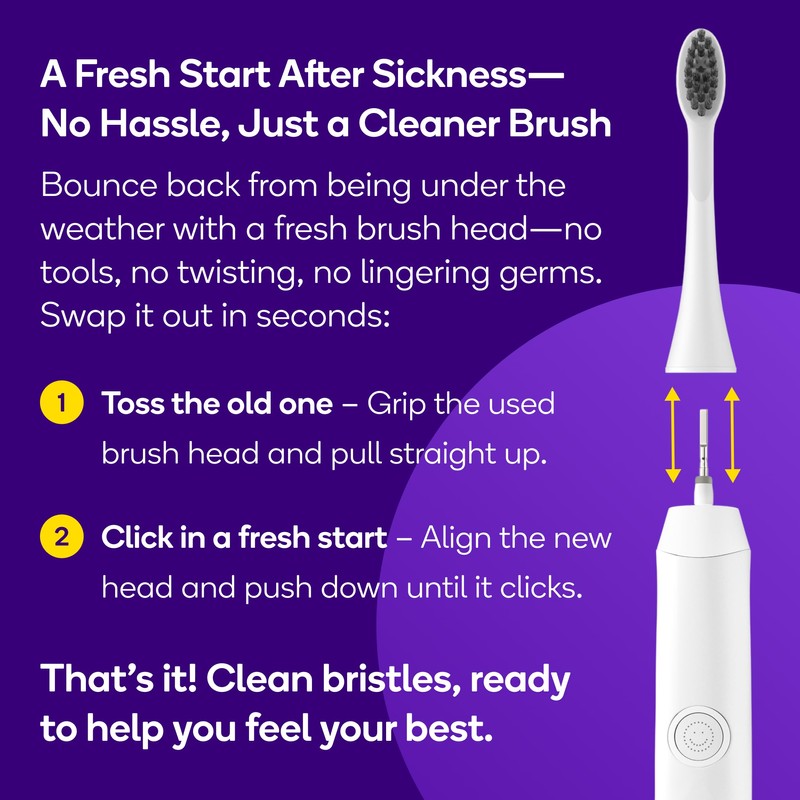 - EMERGENCY REPLACEMENT BRUSH HEADS: When you're bouncing back from illness, the last thing you need is lingering germs on your toothbrush. Our emergency replacement brush heads help you swap out the old for a fresh, clean start so you can focus on feeling your best.