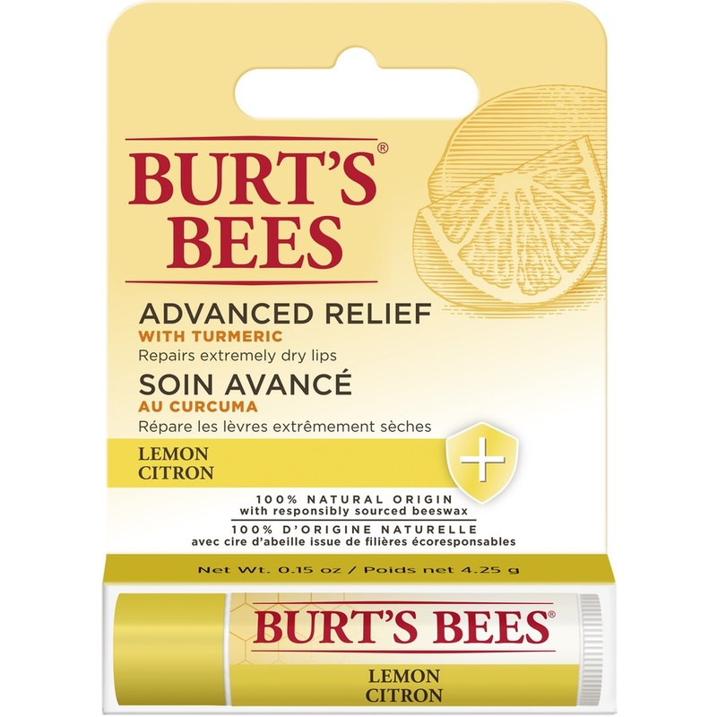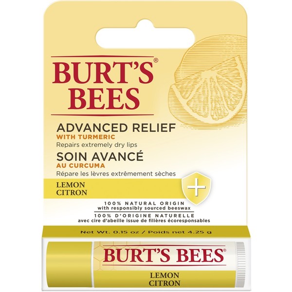Burt's Bees Lemon Advanced Relief instantly relieves dryness, and its fresh Lemon flavor will revive the senses with every swipe. This advanced lip treatment is formulated to repair extremely dry lips and promote healing. Burt’s Bees lip balm provides long lasting moisture when used every 4 hours, relieving dryness. All of the ingredients in this lip moisturiser are 100% natural origin, including antioxidant-rich turmeric to promote healing, and responsibly sourced beeswax and jojoba oil. Advanced Relief formula provides advanced relief for extremely dry lips with the “golden root miracle” Turmeric that promotes healing. This natural lip balm is formulated without parabens, phthalates, petrolatum or SLS.