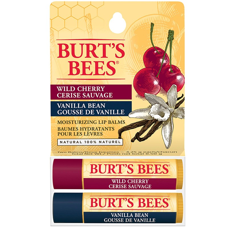 - 2 PACK LIP CARE: Apply Burt's Bees Moisturizing Wild Cherry or Vanilla Bean Lip Balm to nourish and hydrate your lips with a natural cherry or vanilla flavour