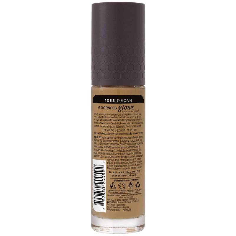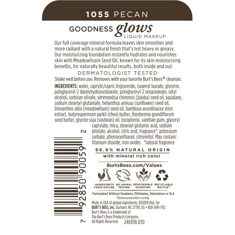 Glowing skin is always in. Burt's Bees Goodness Glows Liquid Foundation in Pecan is a full-coverage, mineral makeup that leaves skin smoother and more radiant with a natural finish that's never heavy, cakey or greasy. This 98.9% natural moisturizing foundation instantly hydrates and nourishes skin and stays on all day. Made with responsibly sourced Meadow foam Seed Oil, known for its moisturizing benefits, it gives you naturally beautiful results both inside and out. Burt's Bees Goodness Glows Liquid Foundation is perfect for dry or combination skin. Available in 18 natural-looking shades to match a variety of skin tones. Pecan is ideal for dark skin with a mix of cool and warm undertones. Burt's Bees Goodness Glows Liquid Foundation is formulated without parabens, phthalates, SLS, petrolatum or synthetic fragrances. It's dermatologist tested and never tested on animals.