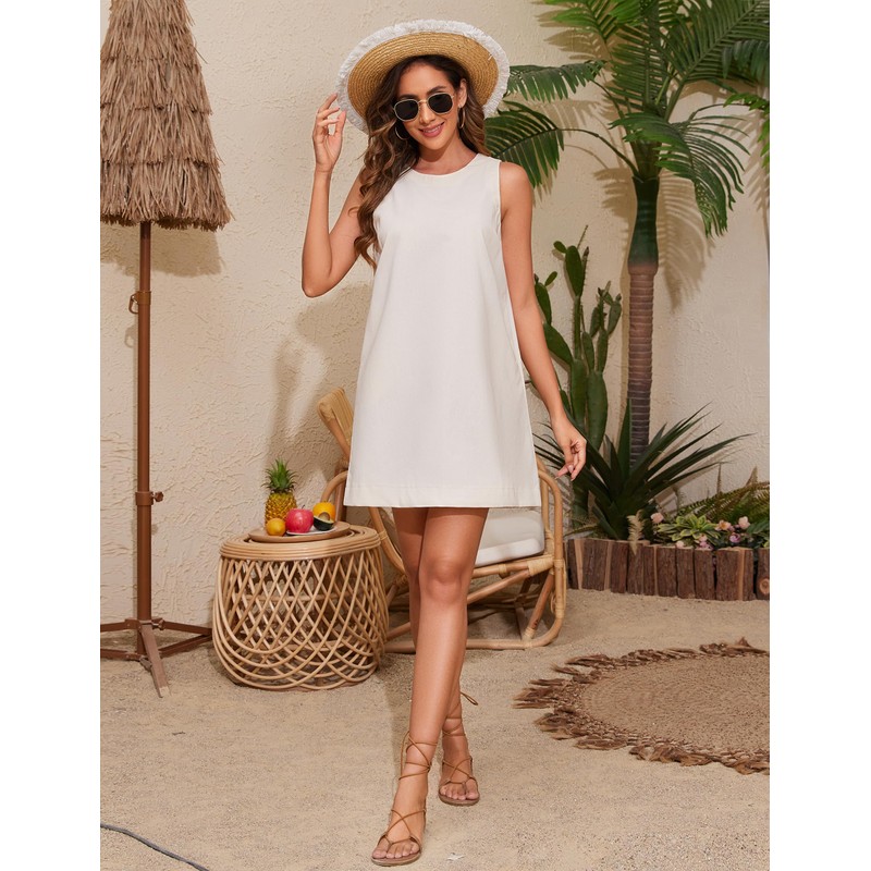 Burtell Women Summer Sleeveless Open Back Mini Shift Dress Tunic Scoop Neck Tank Short Cotton Linen Dress Casual Beach Dress White