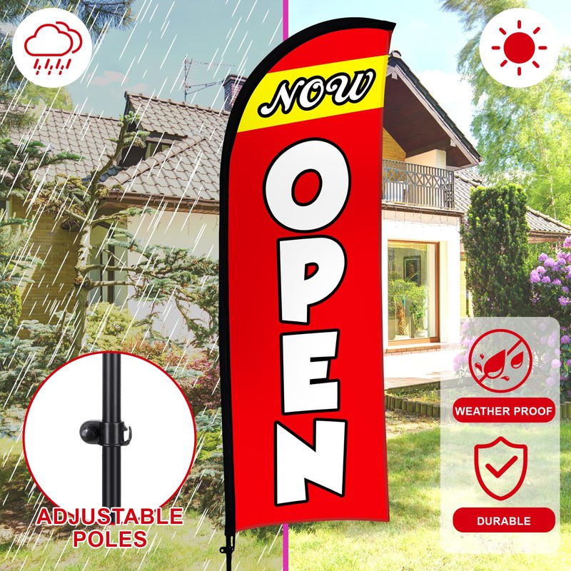 - Convenient Package: : our now open flag set includes everything you need an open feather flag, 8 aluminum flag poles, a stake for secure positioning, and a carry bag; This inclusive set saves you from another purchases and maximizes your convenience