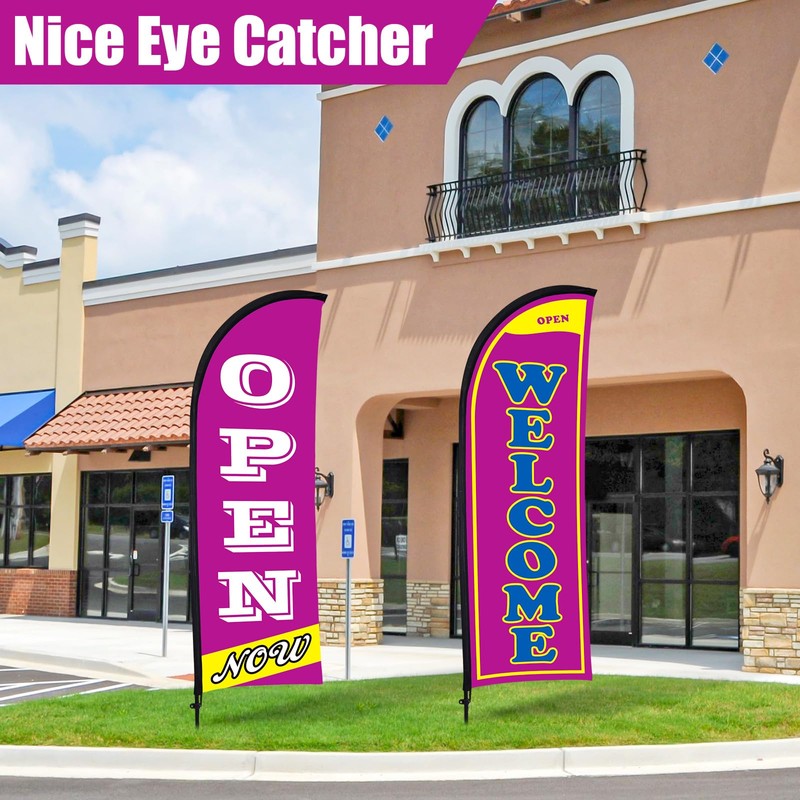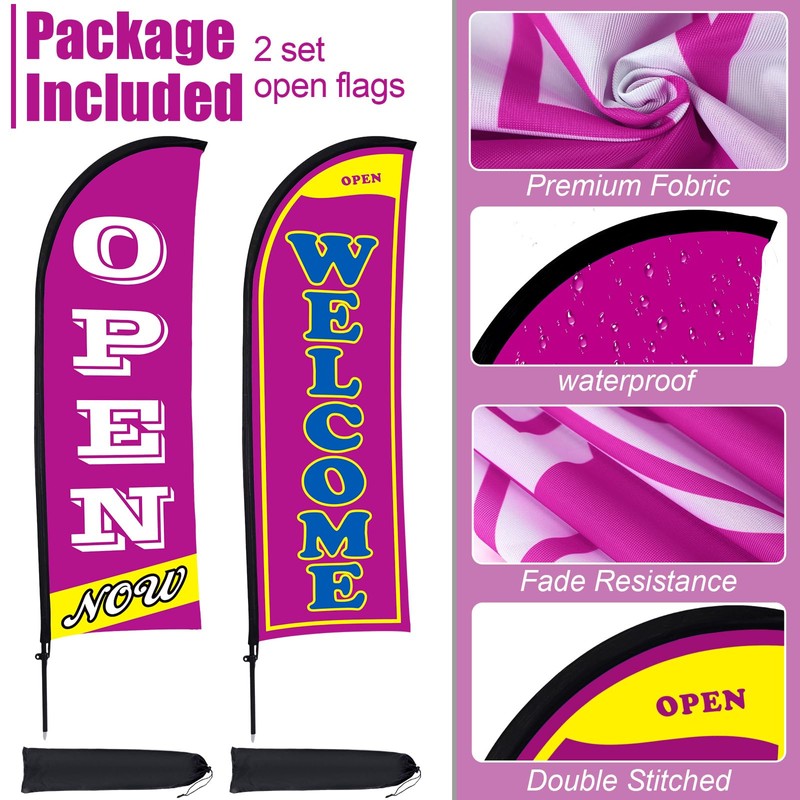 - Enhanced Visibility that Boosts Traffic: the eye catching design of our open themed feather flags can increase foot traffic to your business; With high visibility and dimensions of about 7 x 5.4 ft, these flags will certainly not go unnoticed; Included in the package are 2 sets of high visibility open flag signs for an even wider reach