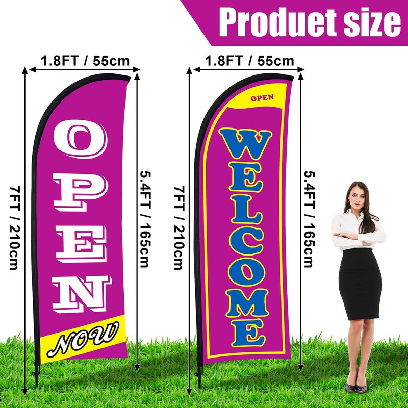 - Enhanced Visibility that Boosts Traffic: the eye catching design of our open themed feather flags can increase foot traffic to your business; With high visibility and dimensions of about 7 x 5.4 ft, these flags will certainly not go unnoticed; Included in the package are 2 sets of high visibility open flag signs for an even wider reach
