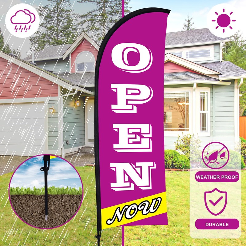 Buryeah 2 Sets Now Open Flag Banner for Business Advertising 7 ft Feather Flag Sign with Flagpole Ground Stake Portable Bag (Purple)