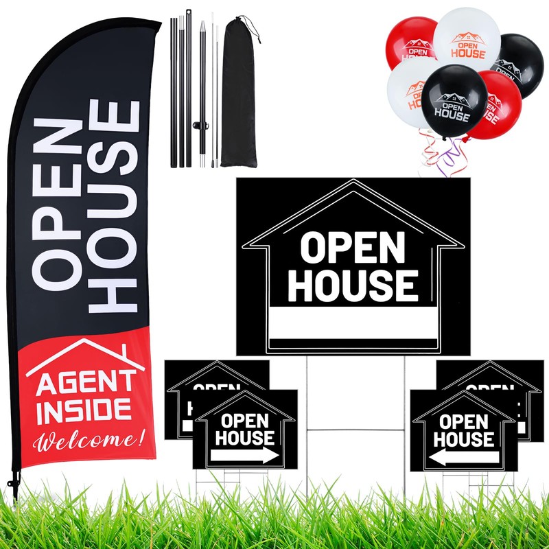 - Catch Attention: whether placed indoors or outdoors, our open house sign package is designed to stand out from the crowd. The vibrant colors and diverse flag options of our kit help catch attention from a distance, driving plenty of foot traffic to your office. If you're looking to increase attendance at your open house, our sign kit is an excellent choice