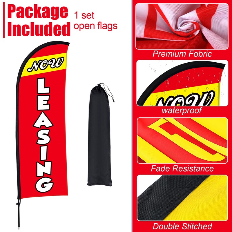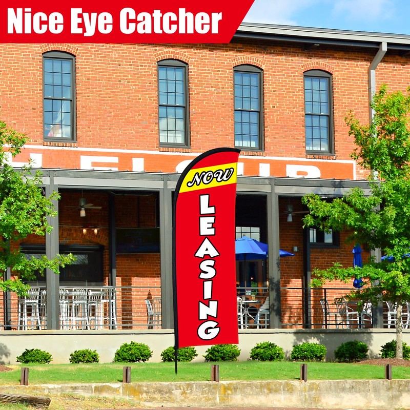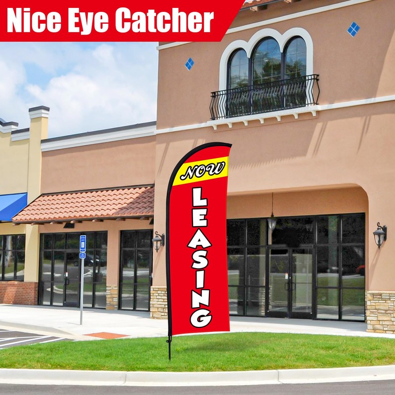 - Widely Application: this now leasing feather flags for real estate is suitable for a wide range of applications, from advertising your business at a storefront or outdoor event to creating eye catching displays for various business purposes, you can place them in front of your business, at the entrance or on the sidewalk