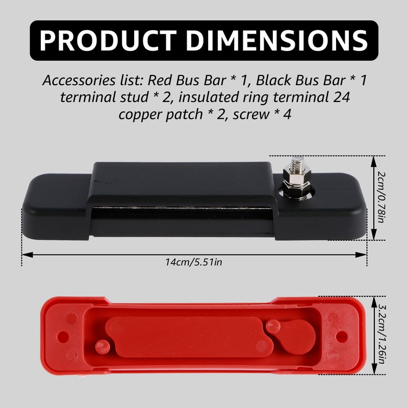 - [Product Parameters] Car Busbars: Maximum voltage: 48VDC, Maximum continuous current: 150A. Each bus bar is equipped with a protective cover made of ABS plastic, which covers the exposed area as much as possible. This reduces the risk of accidental touches and prevents short circuits, which ensures safer circuits.