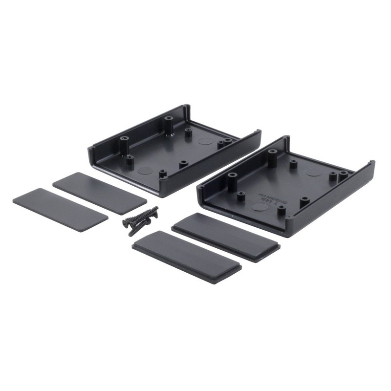 - Box is black ABS plastic, secured with self tapping screws (included). 2 sets of removable end panels.