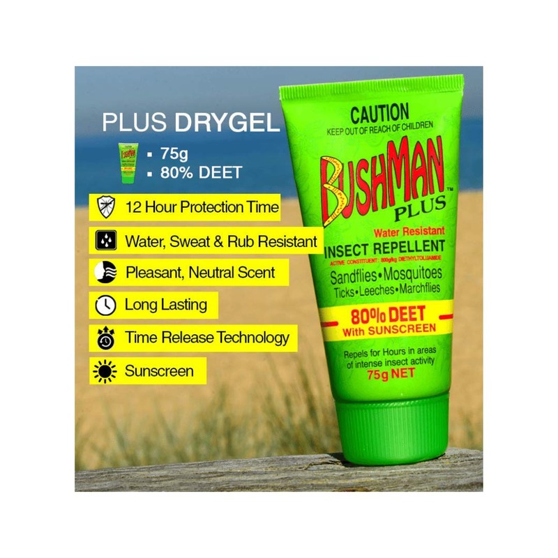 Bushman Plus 80% Deet with Sunscreen DryGel Tube 75 g, 75 grams