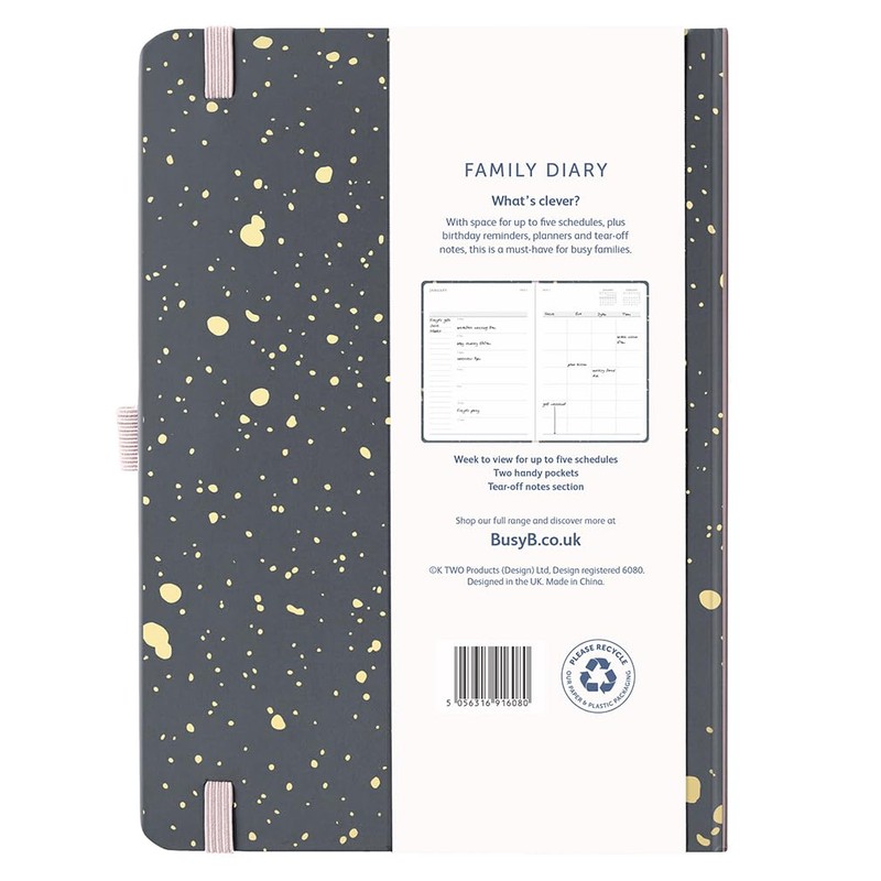 - FAMILY DIARY 2026 - Make 2026 your year to be beautifully organised with the Family Diary from Busy B, featuring a beautiful charcoal & gold foil cover, elastic closure band, pen loop (pen not included) and ribbon page marker. Runs January to December 2026.