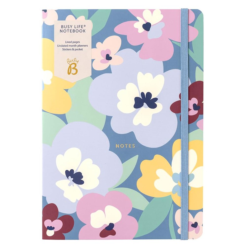 Busy B A5 Busy Life Notebook - Floral Cover - Perfect for Students, Teachers, Work & More with Lined Pages, Undated Month Planners, Stickers, Storage Pocket & Elastic Closure Band
