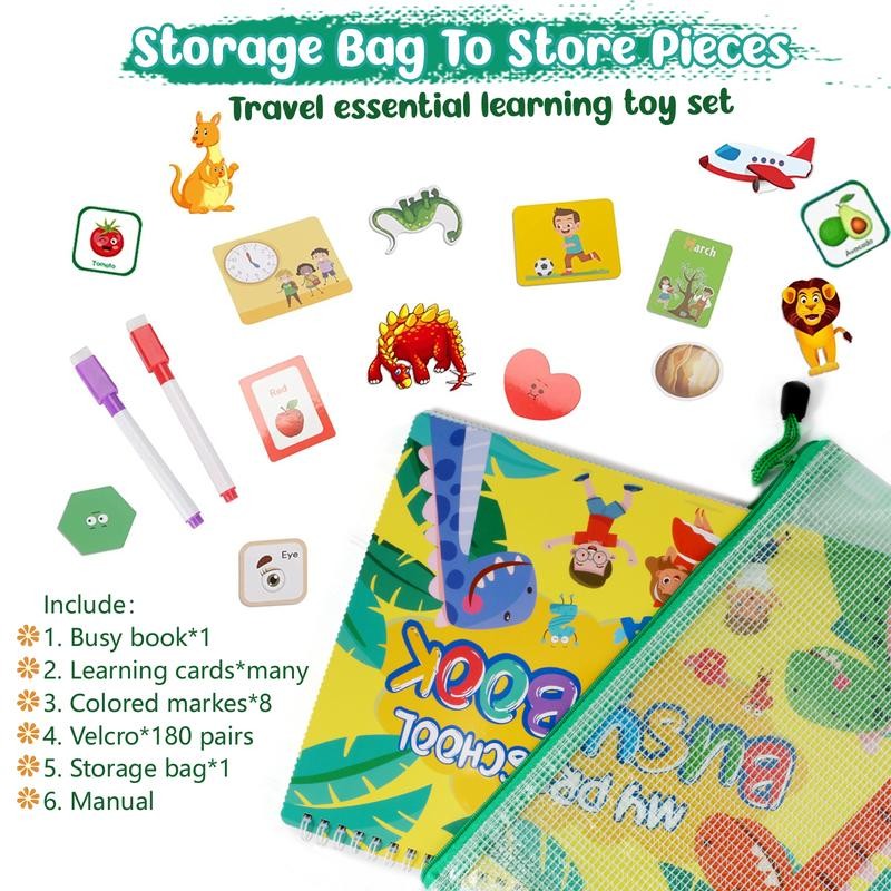 - Busy Book: Our quiet learning book is an excellent educational toy, Contains fun sensory learning activities: matching games, letters & numbers & shapes tracing and coloring, and pre-writing practice, helping to learn while playing.32 Favorite Themes: Early montessori activity book covers 16 themes and 16 drawing & writing pages, including alphabet, colors, numbers, zoo, months, farm, shapes, vehicles, body parts, sports, feelings, occupations, the time, dinosaur park, planets, tracing and coloring. Also comes with 8 colored pens, meeting the needs who love to write and draw.Preschool Educational Learning Toys: The preschool workbook is very suitable for teaching, It helps develop hand-eye coordination, and color perception, and improves fine motor skills, and cognitive skills, Let them develop multiple dimensions.Safe to Play: Our preschool activity binder book passes product certification, Use the highest quality safety materials, double thickened, strong and durable. It is a good preschool learning & education handwriting aid.Ideal Gift: Our busy board is perfect for preschool student, homeschool, is the ideal birthday gift, comes with a high-quality storage bag, is easy to carry, also suitable for Long Car Journeys & airplane activities travel toys, Let you experience the fun of learning in the game.