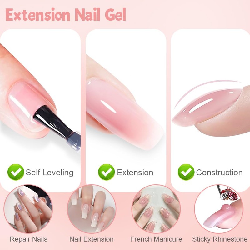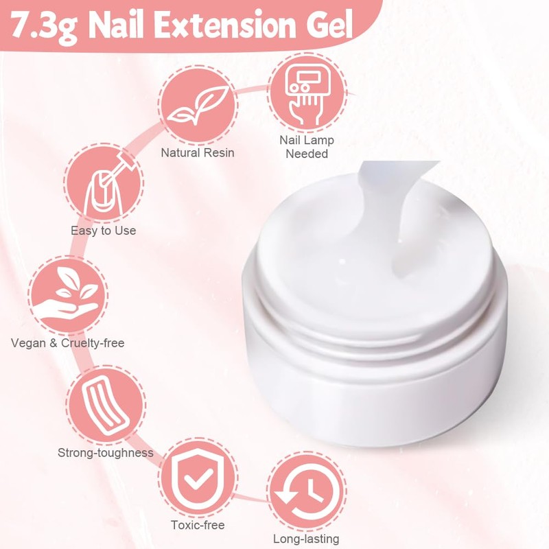 - 【EASY TO USE】Nail extension gel has good flexibility and self-leveling properties. Just brush it on like ordinary nail polish and cure it under UV/LED lamp for 60-120 seconds. It dries quickly and is not easy to clump and peel off. There are also other nail art tools to help you easily complete a series of nail art designs.It is also a great gift for mothers, sisters and friends on various festivals such as birthdays, Christmas, Valentine's Day, Mother's Day and anniversaries.