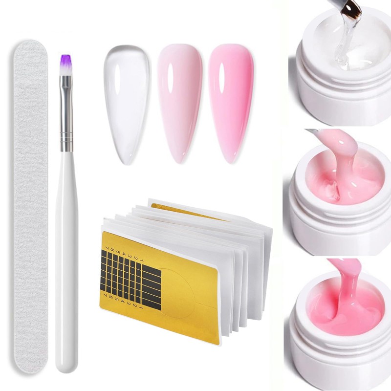 BUTBU Builder Nail Gel, 3 Basic Colors Nail-Extension-Gel, Hard Gels Builder for Nails Repair and Extensions, Inclued nail Brush, Buffer Block and 20pcs Nail-Forms (Clear, Light Pink, Pink)