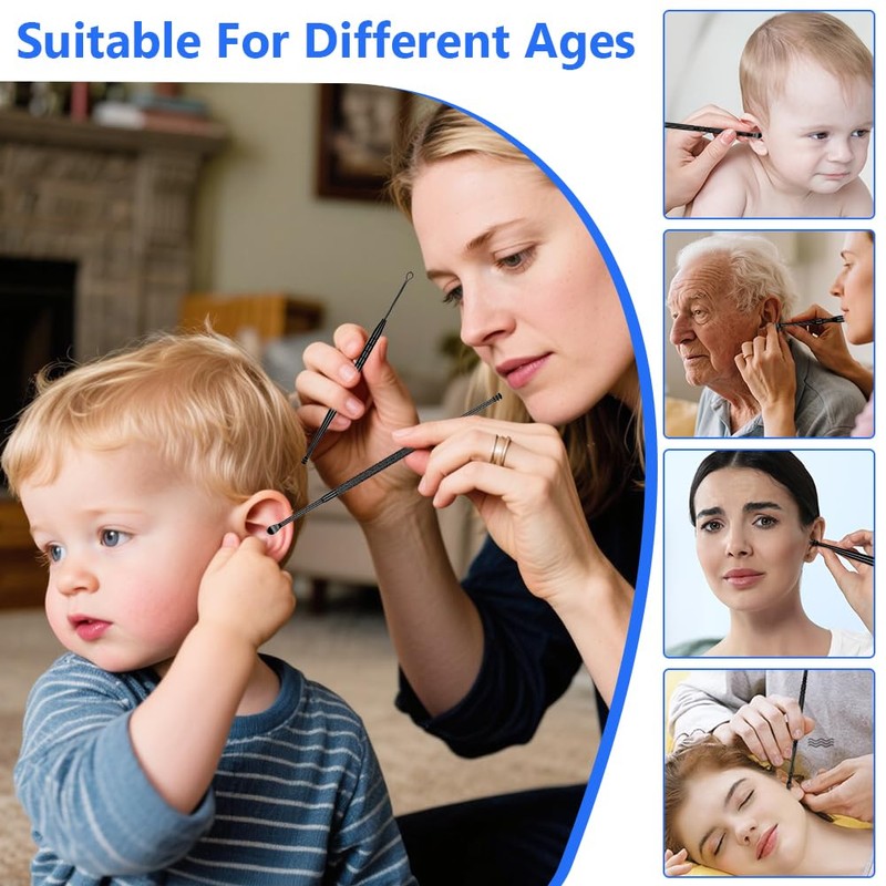 - ERGONOMIC DESIGNThe ergonomic handle and groove on each ear pick are designed for non-slip grip, smooth surface, easy to control, and not easy to get tired after long-term use, and clean the ears easily and effectively. The earwax cleaner comes in different sizes to fit any different ear canals, such as adult and child ear canals.