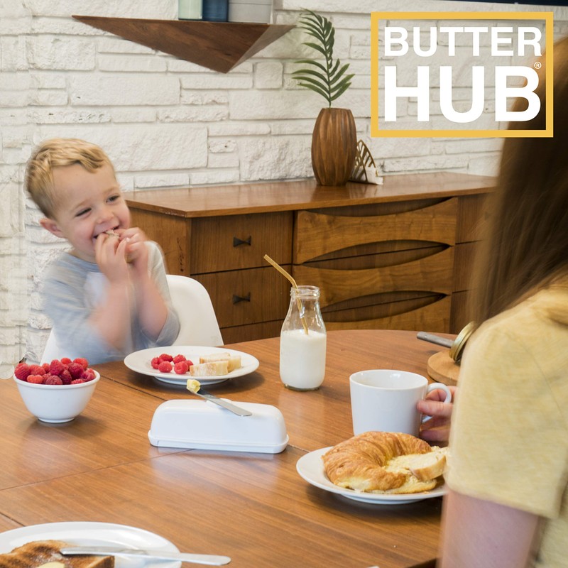 - Butter Hub is a re-imagined butter dish designed with four clever innovations that make serving butter more convenient for the whole family; Clean, compact, timeless, mid-century design compliments any kitchen; Add to your "Pinterest Perfect" kitchen now; Keeps butter soft and easy to spread unrefrigerated for at least 2 weeks; Plastic butter dish with magnetic lid and soft rubber feet.