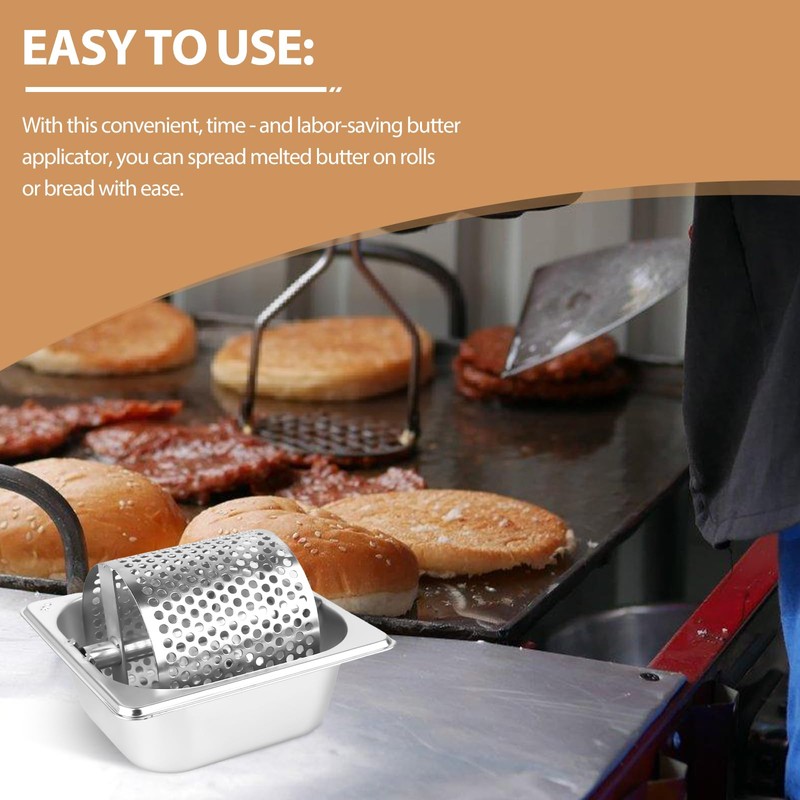 - Easy to use: place a bun or slice of bread on the butter roller and as the wheel rotates, the butter is evenly distributed over the perforations and distributed on the bread