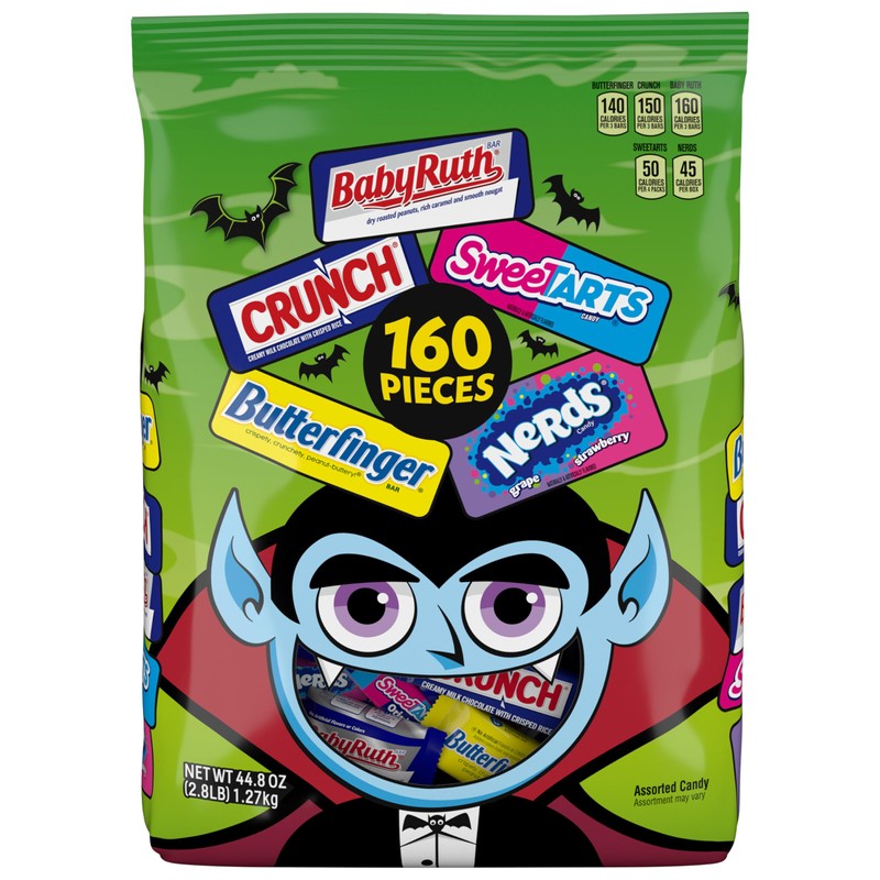 - HALLOWEEN FAVORITES MONSTER BAG: 160 individually wrapped Butterfinger, CRUNCH, Baby Ruth, Nerds and SweetTarts mini and fun size trick or treat candy